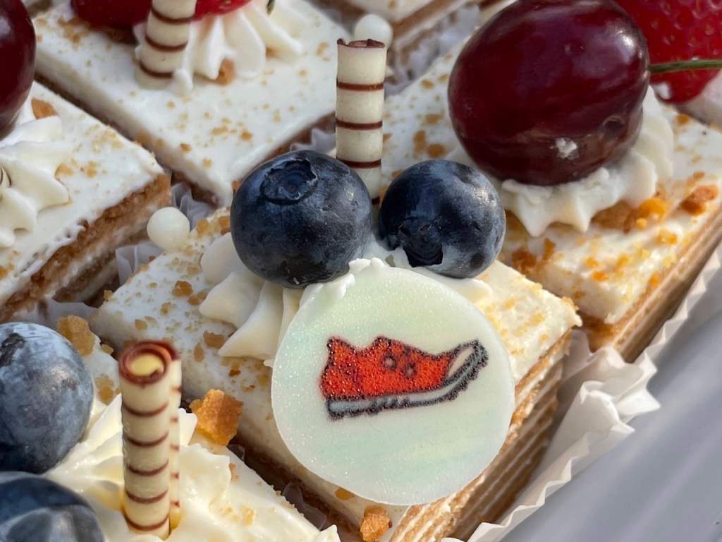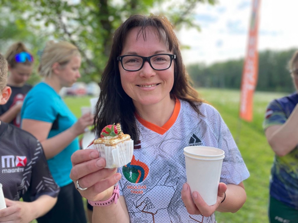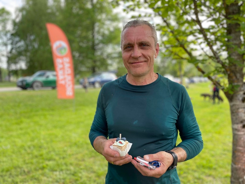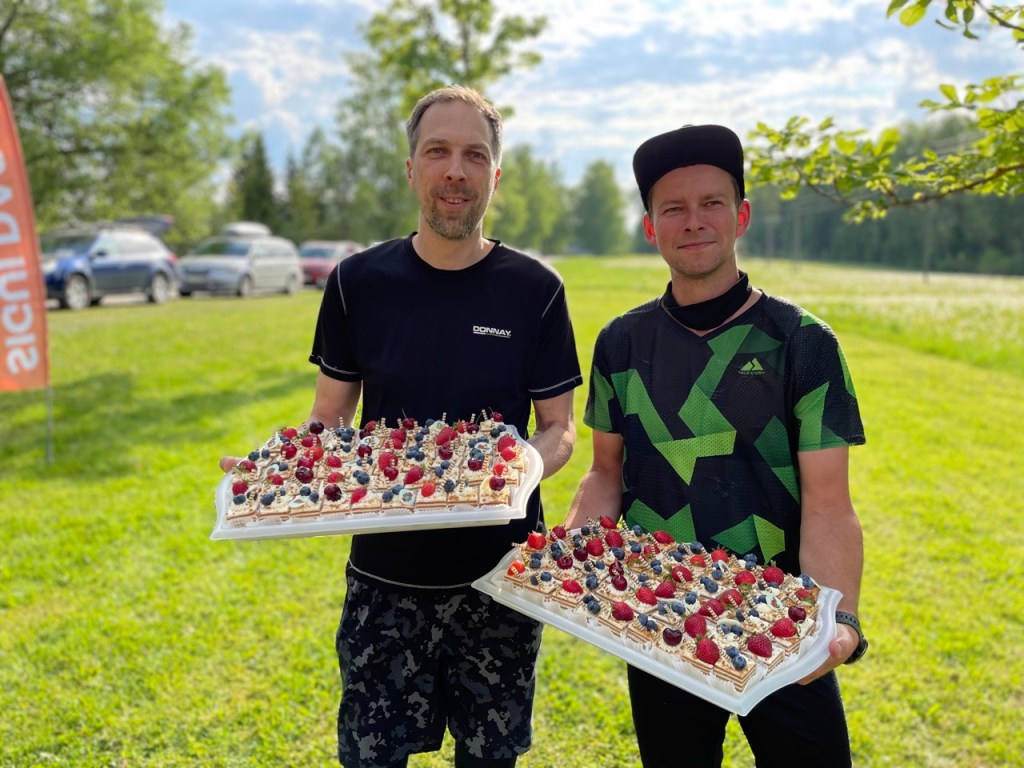Svētku medus kūku mums taisīja “Mājas Kūkas”, un viņiem ir tāda ļoti īpaša iespēja arī izvedot ēdamus zīmējumus, kas kā saldas uzdrukas ar dažādām orientieristiem pazīstamiem elementiem, tika izdaiļotas uz kūciņām: skrienamie buči, kompass, karte, kalns mežā, uzvarētāja medaļa, kontrolpunkta prizma, sportidents un citi piederīgi rīki 😊 Jānis Enģelītis un Iveta Enģelīte bija pārliecinoši profesionāli arī Siguldas Takas kluba logo uz tortes spējuši uzlikt.