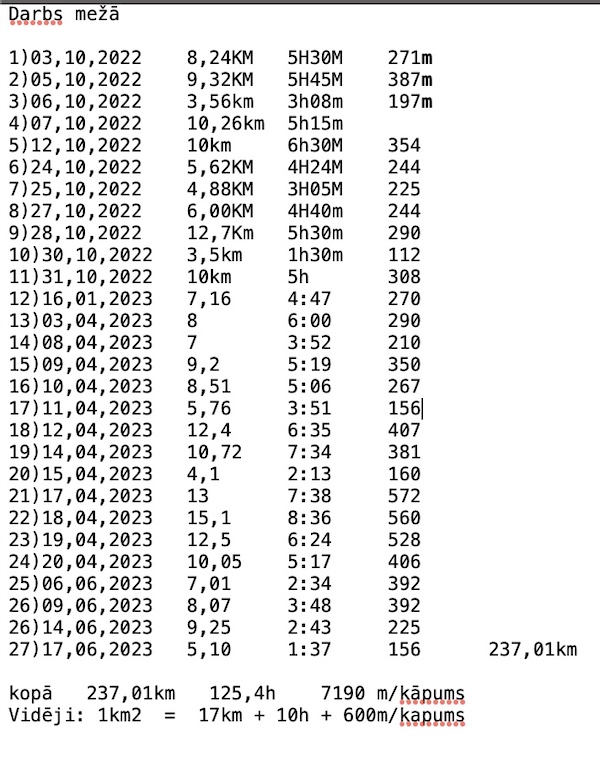 Nu te es tev varu viegli atbildēt – man ir grafiks, viss ir piefiksēts. Faktiski sanāk tā: viens kvadrātkilometrs man ir prasījis vidēji 17 kilometrus nostaigāt pa kalniem, vidēji 10 stundas mežā un uz katru kvadrātkilometru vidēji man sanāca 600 m kāpums Ratniekos. Kopš rudens mežā esmu pavadījis tīras 125.4 stundas kāpelējot un apmeklējot gandrīz vai ikkatru meža stūrīti.